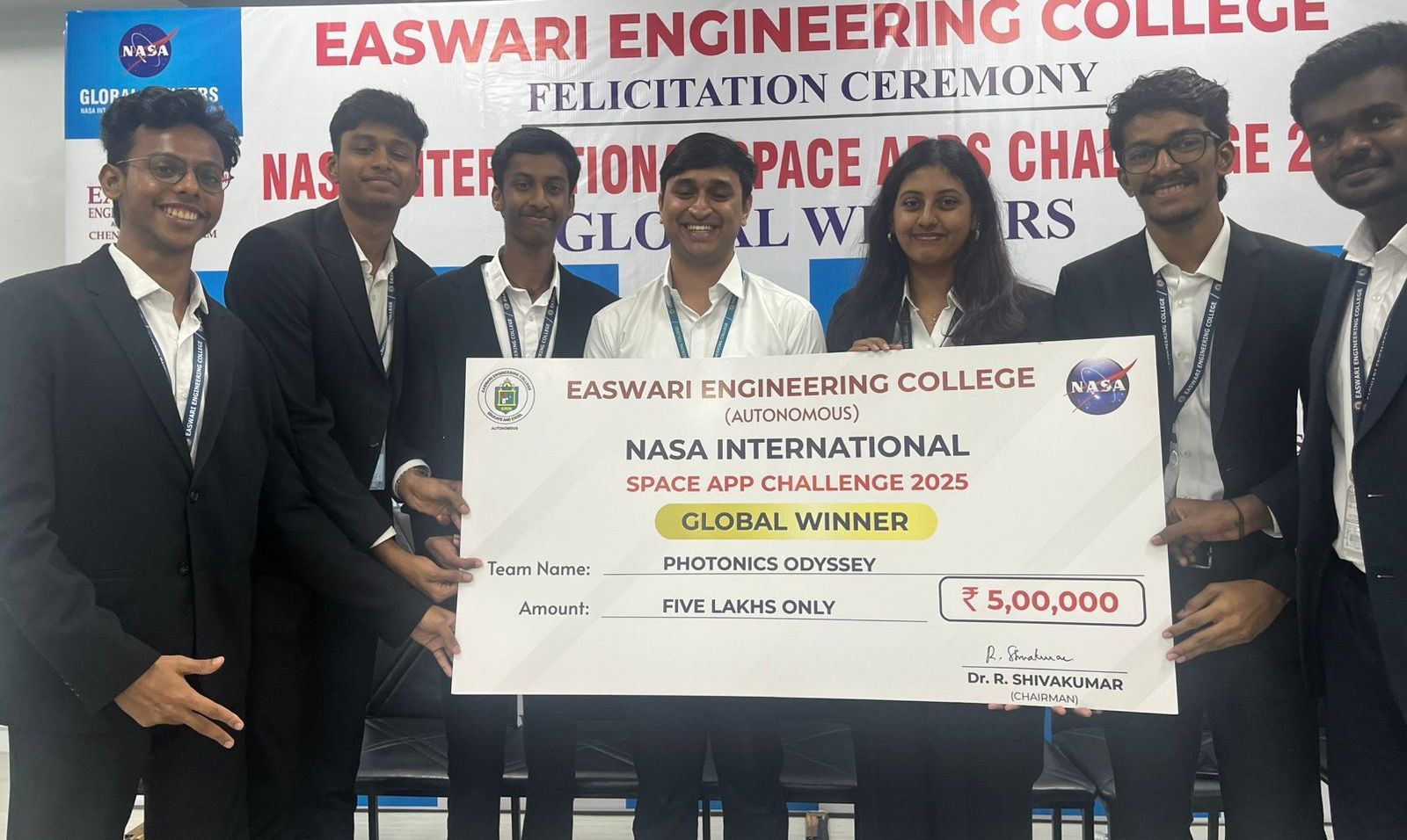 நாசா இன்டர்நேஷனல் ஸ்பேஸ் ஆப்ஸ் சேலஞ்ச் 2025 போட்டியில் வெற்றி பெற்ற மாணவர் குழுவில், இசிஇ இரண்டாம் ஆண்டு மாணவர்களான ராஜலிங்கம் என், பிரசாந்த் கோபாலகிருஷ்ணன், ராஷி மேனன் மற்றும் சக்தி சஞ்சீவ்குமார் ஆகியோருடன், ஏஐ மற்றும் எம் எல் துறையில் மூன்றாம் ஆண்டு படித்து வரும், தீரஜ்குமார் மற்றும் மனீஷ்வர்மா டி ஆகியோர் இடம் பெற்றிருந்தனர்.